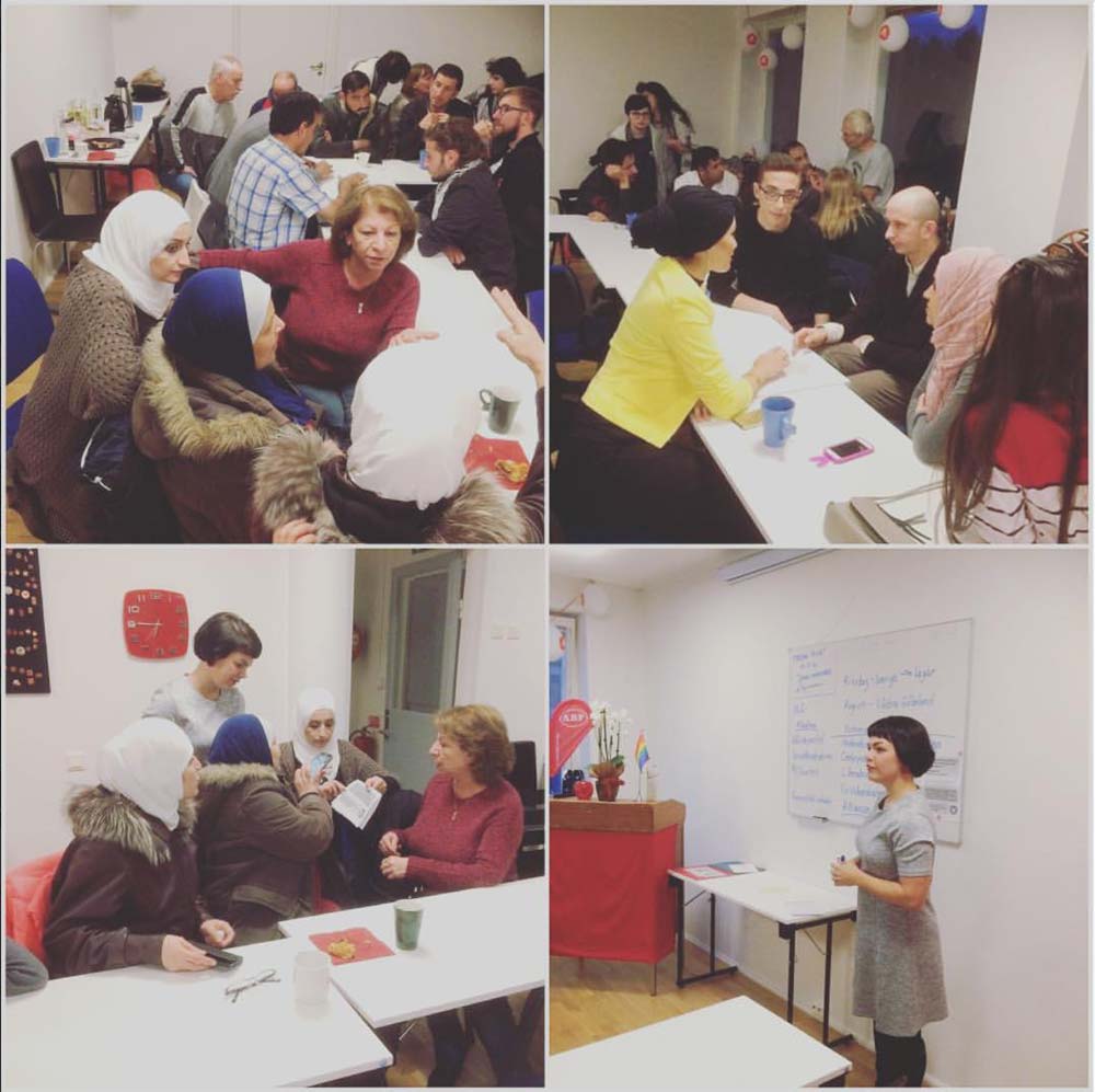 Vi börjar varje träff med en kort föreläsning, sedan pratar vi tillsammans i smågrupper. Många av medlemmarna i Vänsterpartiet pratar flera språk. Det gör inget om du inte pratar så mycket svenska än, vi hjälps åt!