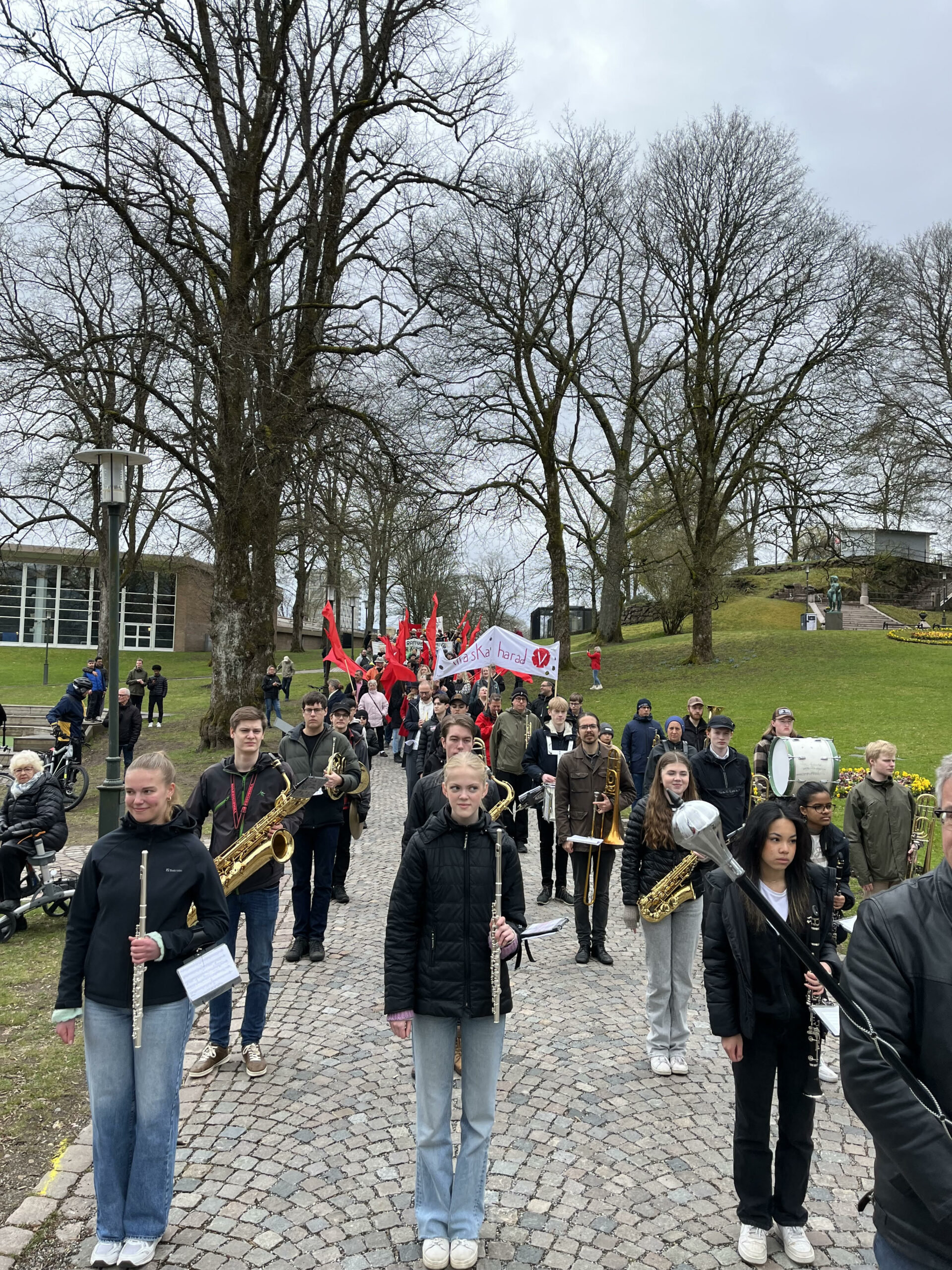 I tåget var vi ca 200 personer som gick och längst fram fanns blåsorkestern från Borås kulturskola. Fler slöt upp för att lyssna på talen i Stadsparken efter att demonstrationståget var avslutat. Innan avmarsch spelade Lilla Krogen Band, ett alltid uppskattat inslag.